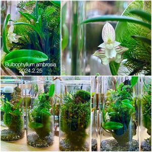 1枚目 : ウサギゴケ(Utricularia sandersonii)ポツリポツリと咲いてくれてる。花茎がキューッと急に伸びてくるꉂ🤣w𐤔 2枚目 ファレノプシス 交配種 枯れてしまったと思っていた株。生きててくれてありがとう❣️なんだけれど状態が良くない。 小さなお花で夜見るともっと黒っぽく見える。管理が悪くて一葉らんみたいな状態。お花をカット✂️して体調を整えよう。 3枚目 : ムギラン(麦蘭、Bulbophyllum inconspicuum)花芽発見したけれどお年頃のお目目( Ꙭ)⸝ෆにはチト辛い大きさ。 4枚目 :Bulbophyllum(Bulb.)ambrosia ‘Yamaharu’ バルボフィラム アンブロシア ‘ヤマハル’1月に花芽が5、6本出たのに全部シケて花が見られず、今年はダメかなと思っていたら、1輪咲いていた。いつ花芽が出てきたのかな?気がつかなかった。はちみつ🍯🐝のいい香り