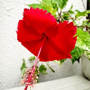 ハイビスカス🌺 レッドフラミンゴ ちょっとシベが曲がってるけど😅やっと咲きました‼️ 去年30センチくらいの挿し木の苗を頂いて冬を越せました‼️もう倍以上の大きさに‼️ クリーム色の斑が入った華やかなお花です‼️