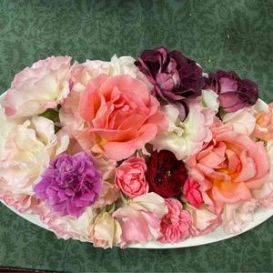 おはようございます。今日が雨予報でしたので、昨日の夕方咲いているバラをカットしました。12月にもう一度咲かせたいので、花首でカットした、ステムの短いバラを集めてお皿に生けました。 マイガーデン 月曜日にはバラを に参加させていただきます。