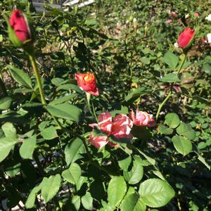 水曜ローズショー に参加させていただきます💕 バイランド 今年で9年目になる房咲きのバラです, マイガーデン ひと枝3〜10程の賑やかな房でコロコロと咲き、秋もよく咲きます。樹形はコンパクトにまとまったシュラブ状です。肉厚な濃い緑色の葉は、黒星病、うどん粉病に強いです。名前はヨーロッパで流行した曲名に因みます。2011年あオーストリア・バーデンFL部門銀賞受賞。 独:タンタウ2008年 アプリコットががったピンク カップ咲き 70枚 花茎:6cm 微香