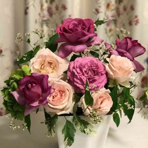 バラ 庭から摘んできたバラでアレンジ💖 パローレ、ヨハンシュトラウス、イヴピアッチェ、ペルシカリア レッドドラゴン、 ハイビスカスの斑入り葉、秋色紫陽花。 マイガーデン 金曜ローズショー に参加させていただきます🤗💖