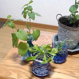 一ヶ月前くらいから室内ではハーブ系を育ててみてます🌿 成長は遅いですが、随分伸びましたね☺️ 緑溢れるお部屋に憧れてましたが、部屋で土を扱うのが割と手間がかかるので、水耕栽培が出来る植物にしようと思いました😅
