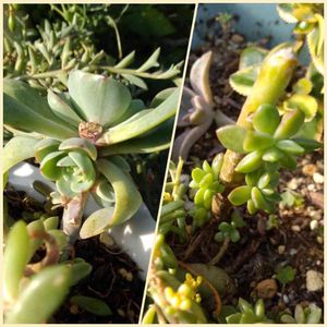 ド真ん中の日🏷 胴切りの日🏷参加しまーす😁 ↖️桃美人 小さな赤ちゃんが出てきた〜✨ ↗️フォーカリア 少し紅葉していい感じ💕 ↘️オロスタキス鳳凰 購入したお店の方に毎朝中心部の写真を送ってお花が咲くかどうかチェックしてもらってます。 お花が咲くと枯れるタイプなのでもし花芽が見えたときには対処の仕方を伝授してもらうためです。 なので最近はホルダーに鳳凰様の写真ばかり並んでます😁 ↙️マンガベ・マチョモカ すっかり緑になっていたマチョモカさん、子株を外して植え替えたら、赤いドット柄が復活してきました💕 真ん中 ディッキア デリカータ 結藍ばぁばさんからいただいたトゲトゲちゃん💕ちょっと大きくなって更に可愛くなりました💖