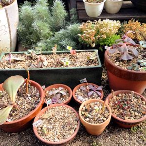 三日坊主人間の私が、なんと記念すべき100pic!(◎_◎;) 何を投稿しよう💦 綺麗な子のpic、一番お高い子のpic、今一番見頃な子のpic、色々考えて…綺麗な写真を載せるなんて、私っぽくない! ってことでコレ。 タイトル「茎の寄せ植え」( ,,>з<)ブッ`;:゙;`;:、 今一番成長を楽しみにしている子供達です。茎にツブツブたくさんついてるものもあれば、これからのものもあり。 どちらにしても、お子ちゃまのたくさんの逞しい成長を願って❤︎ 赤ちゃんが沢山出来たら、一緒に生長を応援して、育ててくれる方に差し上げたいと思います♪ 応募条件: ・ある程度の茎から外せる大きさに赤ちゃんが育つまで気長に待てる方 ・どこかで待ち合わせて直接受け取りに来てくれる方、または送るための住所等を私にお知らせしてもいいよっていう方。 ・ごめんなさい、さすがに応募があんまり多くても困るので、コメントを一回でも入れて下さったことのある方に限らせて頂きます。 ご希望の方はコメントに、まずはどれがいいか入れて下さいね🎶 お待ちしています(≧∇≦)❤︎ 【植えてある多肉種類】 白雪姫、白牡丹、大和錦、ダスティローズ、ハムシー、春萌、デビー、花うらら、初恋、パープルディライト、静夜、プロリフェラ、メビナ、パールフォンニュルンベルグ、アレグラ、ピーチス アンド クリーム、立田、サブセシリス、ルンヨニー、ブルーバード、ギビフローラ、クロマ、ナゾエケ(ペンタドルム?)、ナゾグラプト(桜月or桜牡丹)、ゴースティー 最後になりましたが、いつもイイねやコメント下さっている方、快く岡山支部メンバーになってくれた方、本当にありがとうございます。おかげさまで植中毒ぶりが加速し続けて止まりません(≧∇≦)これからも一緒に楽しみましょうね🎶