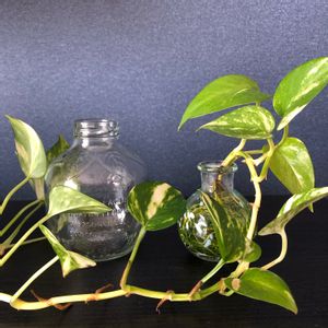 水だけで成長し続けているポトス🌱 小樽の北一硝子で購入した小さな一輪挿しに入れていたのですが かなり成長して中で根がぐるぐる巻いているので もう少し大きな瓶に移すことにしました お引っ越し先はマルティネリの瓶 リューズグラスなのか、ちょっと緑かがかった色が可愛い💕