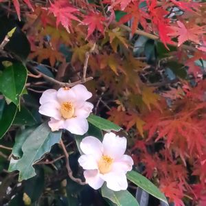 侘助ともみじ 🌿♥️💮🌿♥️🌸🌿♥️💛🌿♥️💮🌿♥️ ウォーキングでかけたら侘助 が いつのまにか 綺麗に咲いていました😃🌸🌿