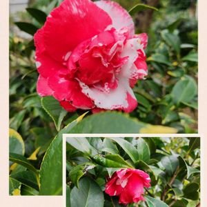 おはようございます☺ 10月24日に投稿してる絞りの椿 別な蕾が開花してました😊 🌿も所々斑入りですし何とも派手です😌 ちょっとねじれた花姿が魅惑的~! 行ってきます😃