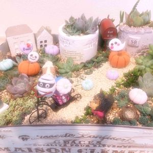 我が家の箱庭ハロウィン🎃 ハロウィングッズ(かぼちゃ全部とミイラさんおばけ)はハンドメイド🎃 作るの楽しかった❤︎ 先日作成した箱庭の中に植えた子も私の大失態でダメになった方が数名…。 けど、他の子たちは元気に成長してます\(//∇//)\