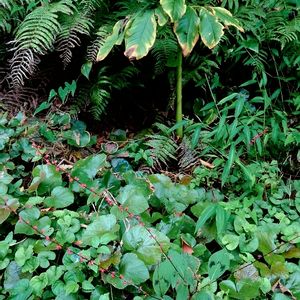 赤いミズヒキの後ろの茎の太くてしっかりとした観葉植物にありそうな植物が気になります🌳 山の中で、ぽつんと生えたなと思っていたら、見る度にグングン成長しました(笑)🌱 (花や実がついているところは見た事がありません。) これで成長は止まっていますが、なんの植物かわかる方いらっしゃいますか? なんか南国っぽいような気も…🤔 ちなみにこの近くの山や畑には、南国でもないのに何故かソテツ?かヤシの木みたいなのが植えてあります。 なんか昭和辺りにソテツとか街中や学校やら、いろんなところに植えられたのかよく見掛けた気が…ブーム🤔?