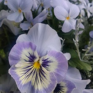 💙花色彩パンジーフィノ バニラスカイ 同じバニラスカイ、こんなに色幅があるんですね🤭 綺麗なブルーもステキ😍 くすみのあるお花も好き😍 ビオラより大きさはありますね😆💕