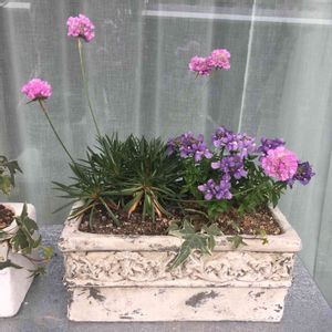 仕入れた植物で、寄せ植え2鉢🌿🌷 右🌱ドドナエア プルプレア、アルメリア、リシマキア 左🌱クレマチス カートマニージョー、エンジェルクローバー(オニキス) みどりの名前忘れた