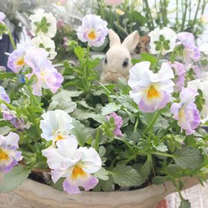 ビオラ恋みやび✨ 真ん中にお花がない!と🐰さんもびっくりしています😅 たぶん這性?なのと、徒長してきたのもあるのかな〜。 お花は色変わりもほとんどなく、ずっと可憐な姿を見せてくれてます🥰