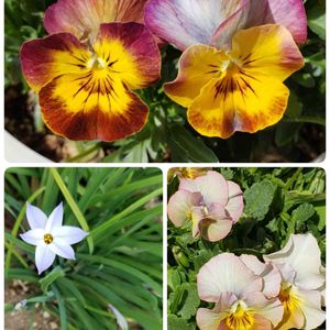 ⬆️元気が出る色合いのビオラ🎵💪😄 ↘️こちらの色合いもステキ❣️🥰 ↙️わが家の庭に、ハナニラ発見❕😃🎶 頑張ろう❗日本‼️ 👊✨