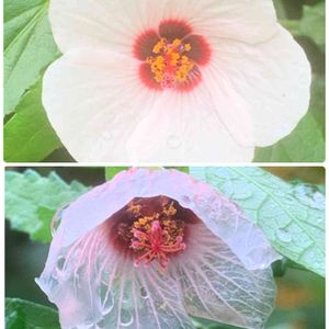 【芙蓉】《アオイ科》 💠今日のお花💠 高砂芙蓉 別名 矢の根梵天花 雨に濡れて硝子細工のように✨。