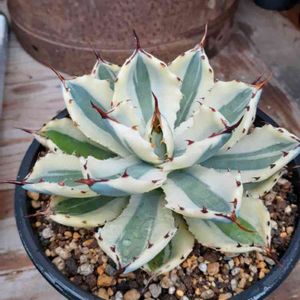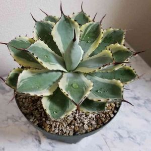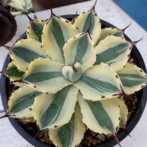 アガベ・吉祥冠・スーバークラウン 植え替え後、初の水やりしました😃✌️ 吉祥冠、育成、苦手な僕ですがこの子は絞めて育てても葉に厚みがあります 地植えの子たち意外は絞めすぎでなかなか大きく出来ていません😢