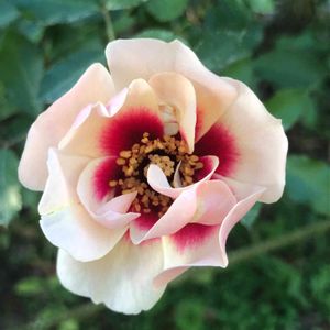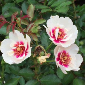 乳白色の花の中心が鮮明な赤色で 日の丸🇯🇵のようです。 たくさんのバラの中で、一際珍しいバラを見つけました。 「ラルサ・バビロン」 バビロンローズシリーズ 🌹古代文明のバラが 今ここによみがえる🌹 ロサ・ペルシカ(原種)をもとに改良された、全く新しい系統のバラを世界に先駆けて日本で販売しました。 花の中心部が赤く染まる「赤いブロッチ」を現在へと受け継ぎ、四季咲き性で日本の気候でも楽しめるバラとなりました。 バビロンは古代都市の名前です。 花径: 5cm(半八重咲き) 四季咲き性で微香あり。 🏷水曜ローズショー に参加させていただきます。