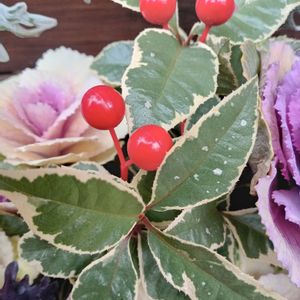 赤い実は残念ながら作り物が挿してありました。 いつか本物の実が見られるとよいです。 斑入りの葉は、白い縁取りがアクセントになって素敵です。