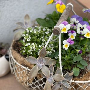 ビオラとアリッサムと多肉ちゃんで カゴ寄植えを作りました♡ あふれるように咲いてくれるのを楽しみに しています♪