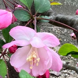 庭桜 10年ぐらい前に植えた庭桜 1メートル位の高さでお花をビッシリ隙間なく咲いてくれる。切花もok赤い実もなります。優れ物です👍