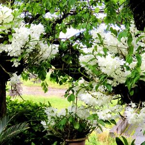 シトシト雨の中、義母宅のデンドロビウム 20年近く前の母の日に私が贈った白いデンドロビウムと、お向かいさんに頂いたピンク色のデンドロビウム 花育ての上手な義母は、 枝垂れ梅やヒトツバの木に着生させて、 今年は特に見事な咲き方です𓂃 𓈒𓏸𑁍𓂃 𓈒𓏸𑁍
