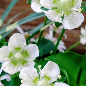 ウメバチソウ(梅鉢草) 別名 (梅花草) ニシキギ科 ユキノシタ科 多年草 自生地 日本全国 山地から亜高山帯 陽当たりのよい染み出るような湿地に生える多年草で、梅の花を思わせるようなかわいい花ですね。 命名は花の姿が梅鉢 の家紋に似ているからとか。 斑入りカリヤスの鉢の中で、毎年増えもせず失せもせず、顔を出してくれます。😅🥰 受け皿に水を溜めてます。 植え混んだのかこぼれ種か忘れてしまいました。😅