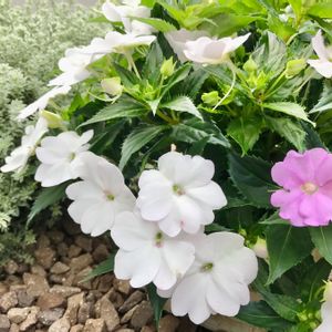 一輪だけピンクのお花が咲いたサンパチェンス💓 真っ白なお花の中から可愛いピンク色のお花が咲いてビックリ👀 嬉しいサプライズです💕 奥のシルバーリーフはウエストリンギア スモーキー🌿 真夏は直射日光が一日中あたり、真冬は冷気にさらされる我が家で一番過酷な環境でも元気に育つ丈夫なオージープランツです✨