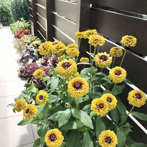 満開のPWルドベキア アーバンサファリ サバンナサンセット🌼 花束のように豪華に咲き揃いました✨ 茎が硬くて丈夫なので、雨風に当たっても乱れることなく真っ直ぐ空に向かって咲いています🤩ゴージャス❣️ 奥には秋色アジサイやヒューケラ、コリウスなどのカラーリーフの鉢植えを並べて、梅雨時期でもカラフルで賑やかなテラスです♪