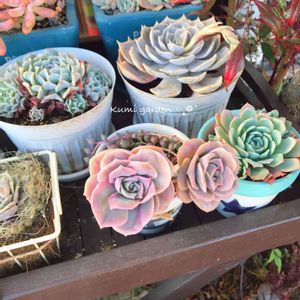 エケ・レインボー・フラッシュ🌈 4か月後の姿4️⃣🗓 澄江の紫色🟣がきれいに写っていないけど、、 ファンクイーン以外は鉢をサイズアップ済⤴️⤴️⤴️ みんな成長してて嬉しいぞよ🌿😊😆
