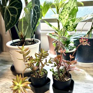 ファンキーな仲間が増えました😊イエーィ😊セダムの銘月さんとカランコエの不死鳥錦🐦🔥さんなどなど😊見てるだけで楽しいです〜😊 銘月は、多肉植物の中ではめずらしく黄色からオレンジ色に紅葉する品種で、カラフルな寄せ植えを作る多肉植物愛好家のタニラーの人たちにも人気の品種です。暑さ寒さにも強く丈夫な品種なので、初心者の人でも育てやすく、また100均でも見かけることができ手に入れやすい品種です。 不死鳥錦は大きな葉の縁から次々と子株をつけるユニークな不死鳥の兄弟品種で、この子株がきれいなピンク色がかった葉っぱです。子株は大きくなると自然に落下し、そこからまた新たに生長していきます。育てやすく、繁殖力も旺盛です。