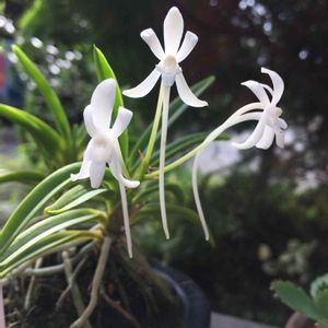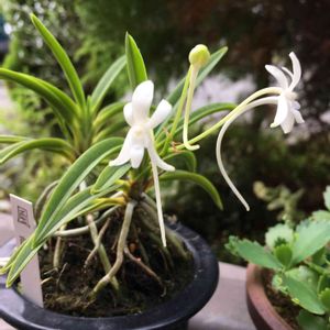 咲いてるぅ♪ お外にぶら下げてたらつい乾かし過ぎちゃって作落ちしてしまいましたが、健気に蕾もまだいくつか待機中です😂 出窓に戻して毎日霧吹きしてます。新芽🌱もっと出してあげなきゃね。これから巻き返し出来れば❗️ これは水苔外した方がむしろいいのかな。根張りが見えた方が調子が分かるし🤔 土佐っ子ちゃんはもともと矢が極細。白花赤目で綺麗なお花の子です。 侘び寂び…☺️ 東京、うちの周りはえらいスコールでした!雨模様続きで涼しいお盆です🎐