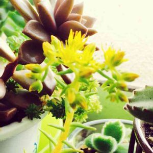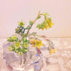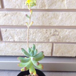 黄色い花がやっと咲きましたー (*'▽'*)❤ ちなみにこの鉢はトイレの窓際に置いてある寄せ植え鉢です。 磨りガラスなので時々窓を開けて陽射しを取り込んだりはしていたものの、日光不足で徒長しまくりですけれども…(*´꒳`*)