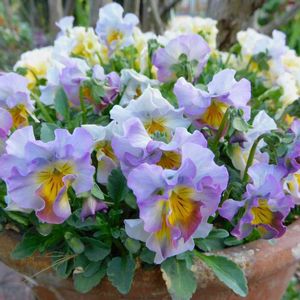 ビオラ 恋みやび ようやく咲き揃ってきました 意外と寒さに弱い? 紫も一緒に寄せてありますが こちらはまだまだ花数が少ない