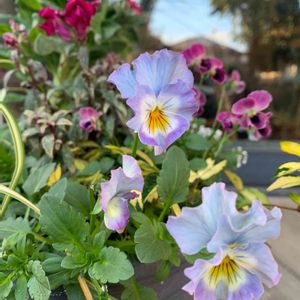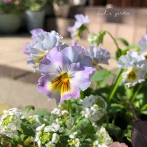 なんて気持ちの良い朝✨ キンとした冬の空気にほんのりとした青空 愛するお花たち✨ 花日和ビオラ 恋みやび 未投稿だった子 恋みやび入荷の頃、なぜか売れ残っていて😳多分入荷当時は蕾しかない上に、まるで匍匐性のように横張の子だったからかなぁ? 枝垂れさせてみようと背高の鉢に植え込んでからひと月。咲いたお花は夢のような色合い(´∀`人) 後ろの赤紫のビオラはノーブランドだけど、ぷちぷちと咲いて可愛いの🥰赤紫と水色って、私のお気に入り💕 どんどん咲いてどんどん伸びて枝垂れておくれ〜(*´꒳`*) お迎えNo.47