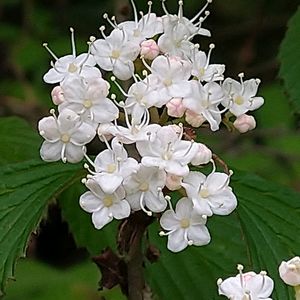 久しぶりの山歩き🎶 小花がたくさん集まって遠くからでも白い花が目立つガマズミ🎶 5本ある雄しべは花先から突き出てキュートです。ほんのりピンク色の蕾も可愛いですね(*˘︶˘*).。*♡ 秋に赤く熟した果実は食用に なります❤️