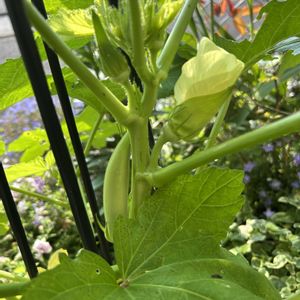 今日のお花 オクラ🌸 ライトイエロー?クリーム色?の花弁 中心の赤におされなシベ とても美人さんよね🤭💕 今年もたくさんお花を咲かせてくれて たくさん収穫出来ました💚
