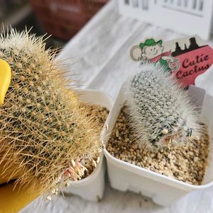 我が家ではサボテンが溶けるのが流行ってるのでしょうか?💦😰😱😢 以前かおりんさんから貰ったミニサボテンの寄せ植え(2鉢に分けてます)の1つがクタッと折れてました。 よく見たら根元が黒く変色して溶けてる★💦 あぁ…………… また胴切りしました。 小さくても胴切りは胴切り⤵️ ドキドキします、ごめんね、と謝りながら…😭 手前のモフモフしてる子です。 無事に根付いてくれると良いなぁ〜🥺