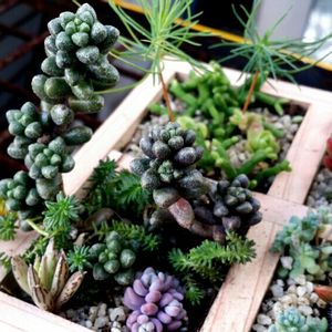 『工場のおじいさんの観察木箱×多肉とセダムとサボテンと、、松の赤ちゃん』 おはようございます(^_^)只今、神戸は曇りです☆ いつも、いいねやコメントありがとうございます(^-^)/ 工場のおじいさんと甥っ子さんと私の三人で、色々企画してモノ作りをしています(^_^)工場は山の中にあるので、狸やキツネ、アライグマ??がやって来る事もあります(^_^) 工場の敷地内にハウスを作っていて、そこで植物の育成をしていますが、入りきらない植物や自分用の分など、どれくらい外でも綺麗に保てるのか観察がてら 雨ざらしで置いてます。 ちぎった葉や形の曲がった苗などは、あちこちにぽいぽいと置いてますが、結構元気に育つだけでなく野性的で面白い形になってたりします。 そんな植物達を使って、何でもありの寄せ植えを作りました(^_^)