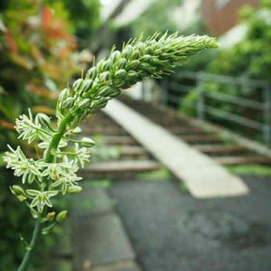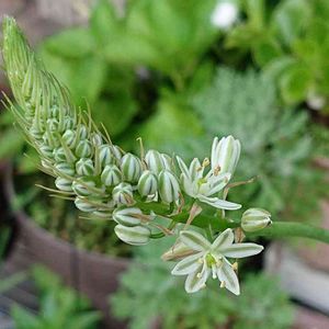 【オーニソガラムコーダツム】 《キジカクシ科》 花言葉 『純粋』『無垢』『才能』『純白』 『清らかさ』 別名 海葱(カイソウ) 子持ち欄(コモチラン) シーオニオン タマネギのような鱗茎から茎を伸ばし、茎先に総状花序を出し 白い花びらに緑色の筋の入った花をたくさん咲かせます。 花弁は6枚で、雄しべは6本。 「海葱(カイソウ)」(Urginea maritima)に似ていることから 「偽海葱(ギカイソウ、ニセカイソウ)」と名付けられた。 大きくなった鱗茎の側面に小さな鱗茎をたくさんつけるので 「子持ち海葱(コモチカイソウ)」「子持ち蘭(コモチラン)」とも呼ばれます。 🏷金曜日の蕾たちに参加します。