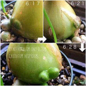 先日、6月17日にUPした シーオニオンのその後です。 17日から4日後の21日 皮が破れて中の子株がチラ見えしてます💧 次の投稿へ続く🔜