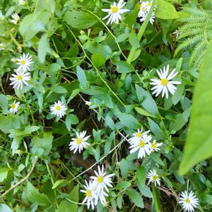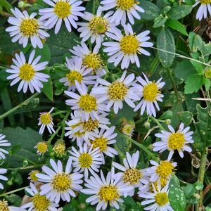 雨の丘陵地☔ そこ一帯に広がって 野菊が咲いていました。 多分ヨメナ🤍💛💚 霞丘陵
