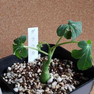 アデニア・グラウカ お迎え:2019/ 3/21 植付け:2019/ 3/27 撮影 :2019/ 7/ 4 鉢底から105cm 地表部での最大径93.8㎜ 三号でぇす。 チャームポイントの根本のツートンカラーは🍠を太らせたいからあえて埋め込んでます。 蔓がある程度まで伸びると勝手に生長点が潰れて、新たな茎が出芽もしくは潰れた茎の手前から脇芽がでます。 久々のベアルートでしたが、🍠も太ってるし、茎も何本も出てるし、葉も生き生きしてるし、土の乾きも早くなったので確認していませんが 推定 発根活着済 と認定しました😆 アデニア・グラウカ 学名:Adenia glauca 和名:幻蝶かずら トケイソウ科アデニア属 原産地:南アフリカとボツワナ