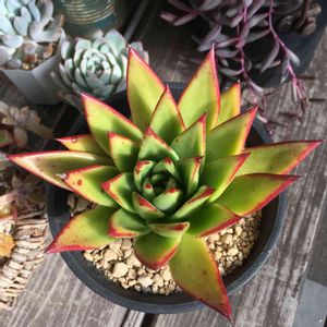 いつの間にか 紅くなってたアガボイデス ❣️ 隠れてるけど葉を何者かに かじられ 傷だらけ。オマケに徒長して 隅っこに置いやってた! ゴメンよぉ〜〜😭