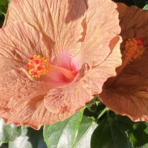 ハイビスカス ハニーブラウンさん💕 やっと咲きました╰(*´︶`*)╯♡ 虫に食べられて穴が空いてるけど😓 冬越しした後中々お花を見ることができなかったハイビスカスさんたち😢 9日にケイトさんの初開花のお花をupしましたが、その後ケイトさんは沢山蕾をつけ、順調に次々開花 ②台風で雨に濡れないように玄関横の軒下にいたのに、吹き込んでびしょ濡れ。それでも以前のように悲しすぎる姿にならずに良かった😮💨 ③その後連日玄関扉を開けるとケイトさん💜の日が続き ④台風が去った後は3輪同時開花。でもどうやっても三方向に咲く花は一緒に撮れず、頑張って2輪😓 ハニーブラウンさんもケイトさんのように次々咲いてくれると良いな💕