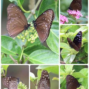 長〜い梅雨が明けた昨日、久しぶりに 公園に 出かけたら沢山の蝶🦋に出会いました。 その中のツマムラサキマダラの 色々な表情を写しました。 左上2頭の蝶がホウライカガミの蜜を仲良く 吸ってますがこの2頭で蝶の形に なってませんか? ♂♀は翅の模様で見分けます。 下2頭ストライプ模様は♀