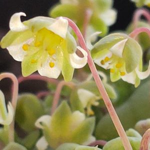 満開の クラッスラ・ネモロサさん😻💚🤍💛 恥ずかしがりやさんで下向きに咲くので 助平心で覗いて🤳✨ 人間だったらお縄もんですな…😺💧