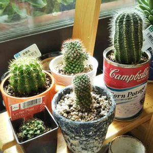 これ、全部100均サボテン 🌵 金盛丸は一番の古株。 しばらく日の当たらない窓に放置していて小さく萎んだしょぼしょぼ状態になっていたのが、昨年の植え替え以降ここまでに成長。 たくさん出来ていた子株も別の鉢に株分け寄せ植えで今のところ元気 💪 マグニフィクスはキャンベルスープ缶に植えたのが気に入ってたけど、大きくなってきて窮屈そうなのでこの子達をまとめて寄せ植えする事に。 個性的な形に育ったナナ子も一緒に。 手前の子は名前不明。二段腹みたいな育ち方しました 😅