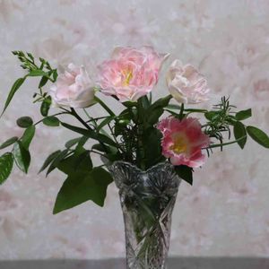 4月16日 (土) 11:50AM アンジェリケ🌷さんを生けました ミニ薔薇🌹さん(蕾)とアイビー🍃さんを添えて