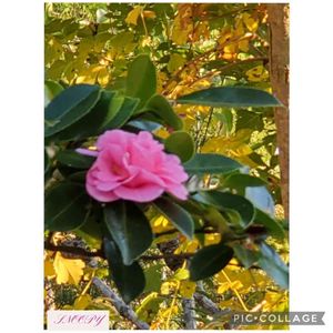 お寺さんの境内で 🌸山茶花🌸さん イチョウの黄葉と少しの青空が素敵を演出してくれてます