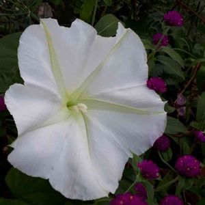 種から育てた夜顔さん! 今夜、やっと開花を見る事が出来ました😭 初花は旅行で見逃し、2つ目は咲く寸前に娘に手折られ😱 三度目の正直にして、大きくて優雅な花を見る事が出来ました(*^^*) 鼻炎のため、よい香りを確認出来ていませんが(^_^;) 蕾がたくさん付いてきたので、元気になったらクンクン確かめたいと思います!✨ P.S.初めてスマホでフラッシュ撮影しました! ベランダで何度も怪しく発光させていたのは私です(^^;; 播種日:2017.5.17