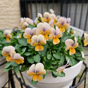 この土日は寒くなるって聞いてたけどけっこう暖かく風もなく穏やかでした☺️ ルネッサ〜ンス🍷🍷風の鉢に ビオレッタグレイッシュオレンジモンキーズとアンティークフリルパンジーフルールを門柱に並べてみた😙 picを取ったら即撤収💨 落ちたら危ないからね〜 ④フルールの裏側からまた違う色とフリルで咲いてきた😆 フルールは色んな色で咲くから得した気分🤭 ⑤種まきのレディ咲きました お花は小さくマイガール風 マイガール本物見たことないけど💦 えらい濃い色で咲いたなぁ😳